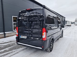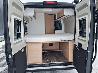 Tekniska data: Årsmodell 2025, mätarställning 2300 mil, Fiat Ducato chassis, turbo diesel på 140 hk, 8-växlad automat. Längd 599 cm, totalvikt 3500 kg (B-kort), lastvikt 580 kg, 4 bältesplatser, 3 sovplatser (2 dubbelsäng bak + möjlighet att bädda i dinetten). Reg nr WAX40A, skatt 8895 kr.