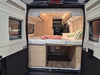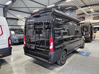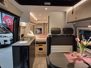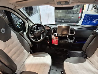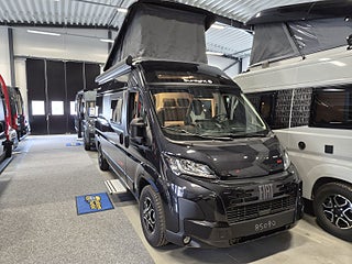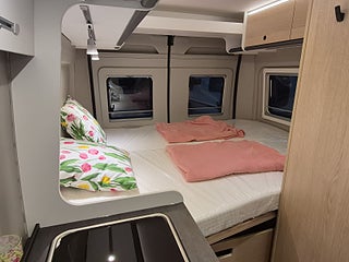 Tekniska data: Årsmodell 2026, Fiat Ducato chassis, 140 hk, automatlåda. Längd 599 cm, totalvikt 3500 kg (B-kort), lastvikt c:a 450 kg, 4 bältesplatser, 4 sovplatser (2 tvärbädd bak + taksäng i pop-up tak).