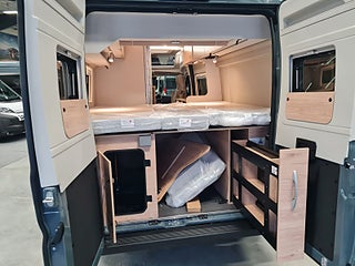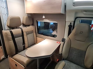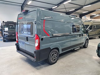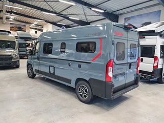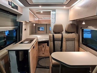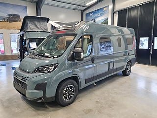 Tekniska data: Årsmodell 2026, Fiat Ducato med ny front och nya digitala instrument, turbo diesel på 140 hk, smidig 8 växlad automat. Längd 599 cm, totalvikt 3500 kg (B-kort), lastvikt c:a 500 kg, 4 bältesplatser, 2 sovplatser (dubbelsäng bak), möjlighet till extra säng fram.