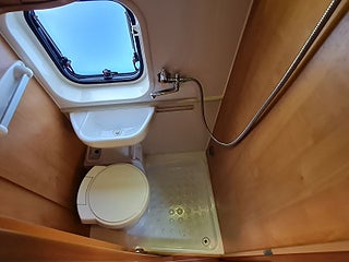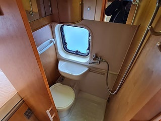 Planlösning: Smidig och flexibel planlösning med vändbara stolar och halvdinette. Flexibelt och rymligt badrum med dusch möjlighet - med riktig dörr. Dubbelsäng bak med ordentlig madrass och lastutrymme under.