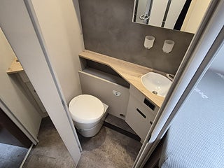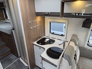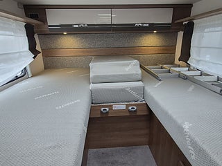 Planlösning: Mycket fint trä och snygg klädsel i bra material, matplats med vändbara stolar, stort bord med extra sittplats på kortsidan. L-kök, spis med 3 lågor, stort kylskåp med separat frys. Ugn. Snyggt badrum med toa och dusch separerade, bra duschkabin, mycket praktisk dörr som kan stänga sovrummet eller toan. Garderob, gott om förvaringsutrymme, stort garage under sängen bak.