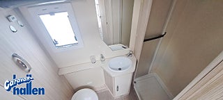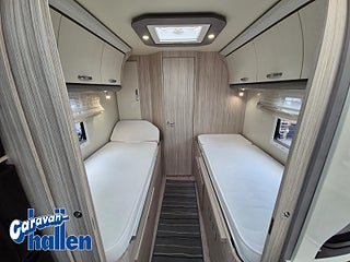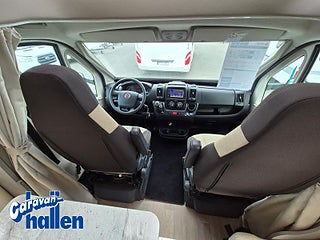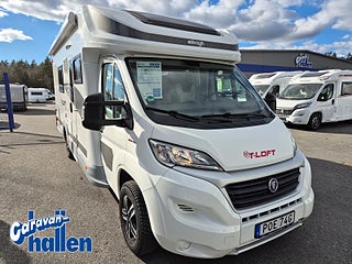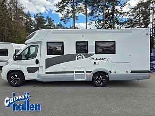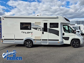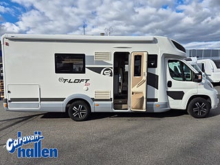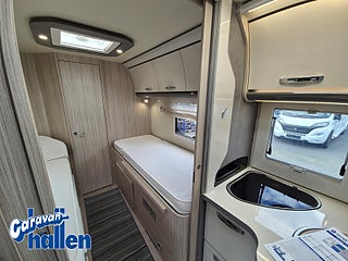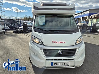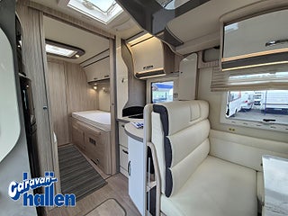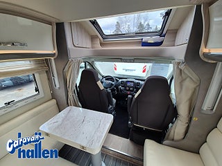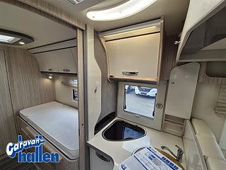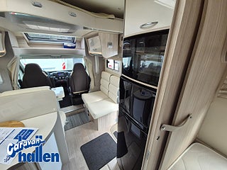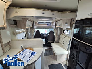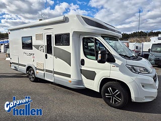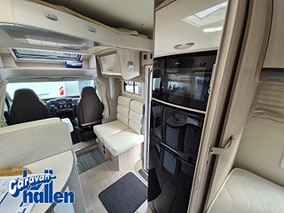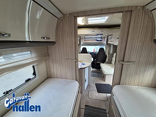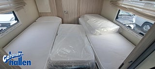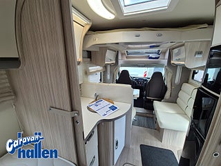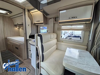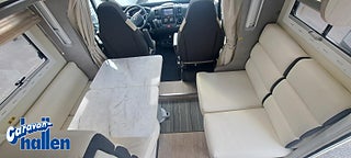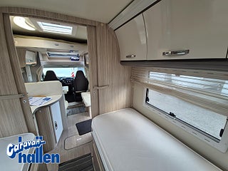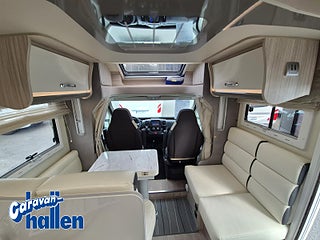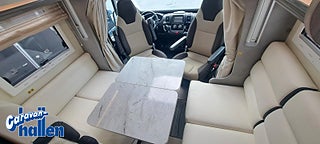 Modellår: 2019, Karosstyp: Halvintegrerad med taksäng, Värmesystem: Truma Diesel - luftburen fläktvärme, Långbäddar som kan breddas genom utdrag och extra madrass. Toalett med separat dusch bak. Elektriskt manövrerad sänksäng fram. Generöst med belysning. Dieseldriven luftburen Trumavärme AES-kyl med separat frys. Ugn Solpanel Cykelhållare Medieenhet med backkamera