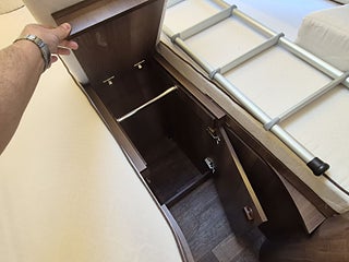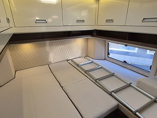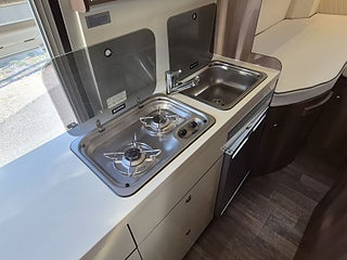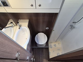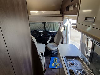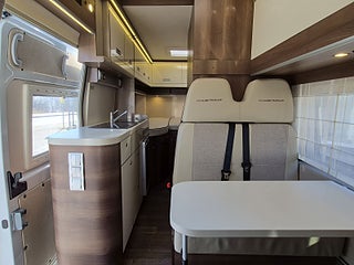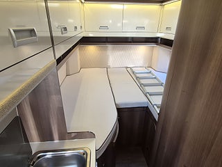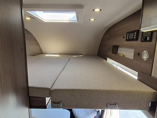 Planlösning: Smart planlösning med generöst kök till vänster om dörren, halvdinette med vändbara stolar fram. Badrum med separat dusch och taklucka med fläkt, sovrum med långbäddar som kan bäddas ihop. Stort separat garage bak. Alkovsängen kan lätt fällas ut ovanför matplatsen - men takhöjden under sängen är bra nog för vuxna sittande - den lösningen är inget annat än imponerande. Dubbelgolv ger samma golvnivå i hela bilen och rymmer alla tankar och installationer - frostsäkert.