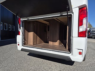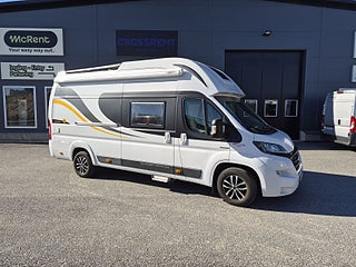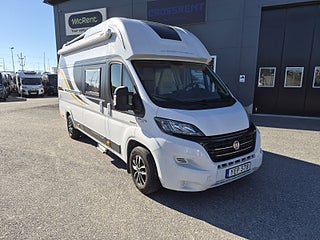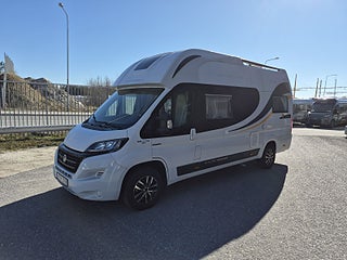 Tekniska data: Årsmodell 2017, mätarställning endast 2400 mil. Fiat Ducato chassis, turbodiesel på 150 hk, automatlåda. Längd 636 cm, höjd 300 cm, totalvikt 3500 kg (B-kort), lastvikt c:a 400 kg, 4 bältesplatser, 4 sovplatser (2 långbäddar bak, otroligt innovativ "alkovsäng" fram för 2). Reg nr YEP378, skatt 6577 kr