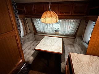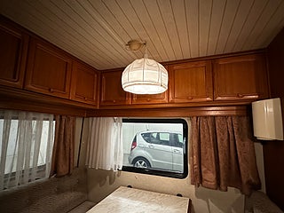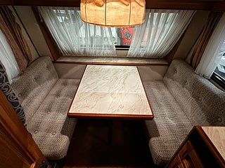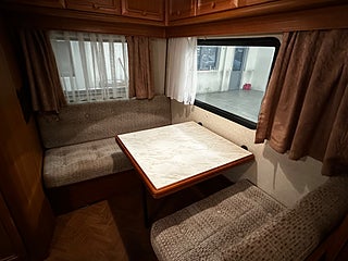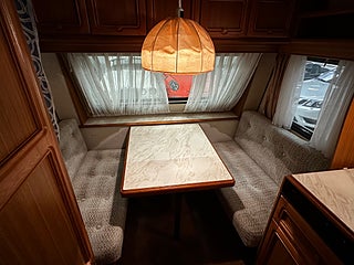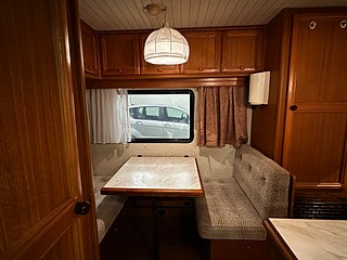 Optimal planlösning med toalettutrymme direkt till vänster om entredörren med Thetford kassettoa som man tömmer utifrån via separat lucka. Liten sittgrupp bredvid toan inkl bord.