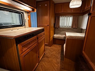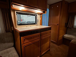 I mitten av vagnen finns köket med 3 lågig gasolspis och didkbänk. Kyl med frysfack.
