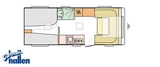 Modellår: 2018, Värmesystem: Truma - luftburen fläktvärme, Stort kylskåp med separat frys, Bluetooth-anslutning till högtalare, påsmarkis (lös) Våningssäng med tre bäddar