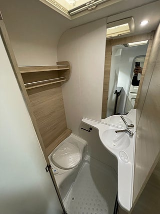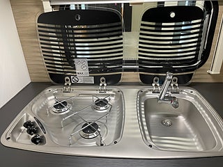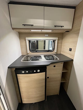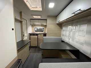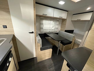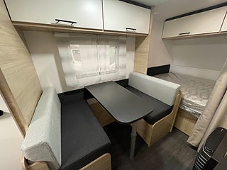 När man kliver in möts man av den luftiga och hemtrevliga planlösningen! Det ljusa träslaget med den tvåfärgade klädseln ger en stilren och välkomnande känsla! I bak finner man det rymliga köket som erbjuder gott om plats med bra arbetsytor. I mitten finner man loungen som utan problem rymmer 4 personer, denna soffa går även att bädda om till en säng om så önskas. I fram finner man sovrummet med en mysig och rymlig dubbelbädd som bjuder in till en god natts sömn. Toaletten är rymlig och är utrustad med dusch.
