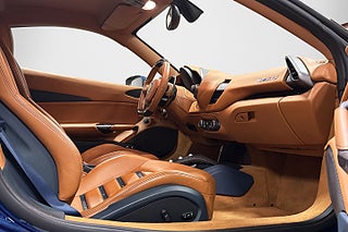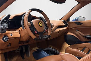 Interiören bryter av mycket fint i Cuoio 4609 med Blu Medio 112807 inlägg och sömmar. Delar av Daytona stolarna och exempelvis bältena är smakfullt valda i Blu Medio, som matchar exteriören mycket fint. Vidare är konsolen i mitten samt ratten i kolfiber. Ratten utrustad med LED shiftlights. Vår 488 är skyddad med PPF folie på alla utsatta ställen sedan ny. Nu har denna folie ersatts av helt ny skyddsfolie i förebyggande syfte. Utrustningsmässigt har bilen allt som en 488 behöver och däribland även lift system som är ett måste på en bil som denna.