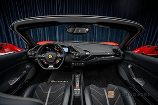 Exteriören är lackerad i den ikoniska Rosso Corsa röda färgen, och pryds med de klassiska Scuderia Ferrari Shields på framskärmarna. Den sportiga och exklusiva känslan förstärks av gula bromsok och keramiska bromsar som inte bara ger ett aggressivt utseende utan också exceptionell bromsförmåga.