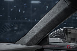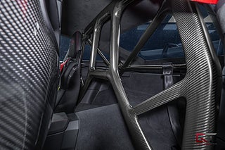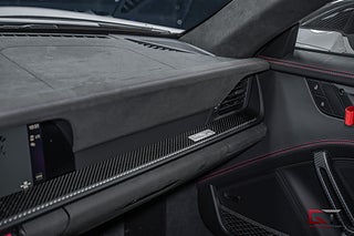Just detta iögonfallande exemplar klär sig stilrent i lacken "White" som kombineras med lättviktiga magnesiumfälgar lackerat i "Pyro Red" och svartlackerade bromsok. På insidan fortsätter det banpreppade temat med skalstolar i svart läder/race-tex och framför föraren finner man den avancerade sportratten i race-tex. Interiörpaketet i kolfiber ger exklusiva dekorinlägg som sträcker sig längs mittkonsol och paneler, det kombineras bland annat med det högkvalitativa surroundljudsystemet från BOSE, samt med den härliga konturbelysningen som tillsätter en härlig stämning.