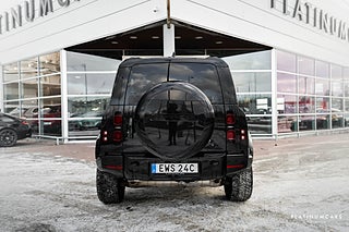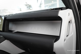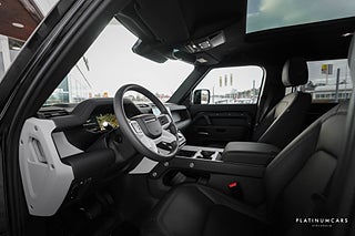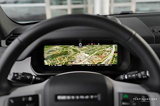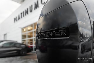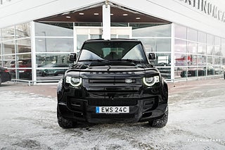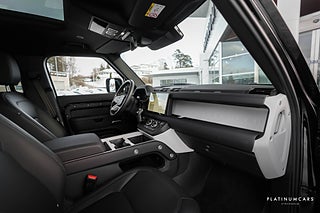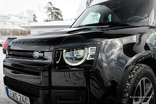 Nu i lager en riktigt fin svensksåld (MOMS/VAT), Land Rover Defender P300e PHEV 300hk AWD 2025 i färgen Santorini svart med svart läderinteriör och endast 1500mil!