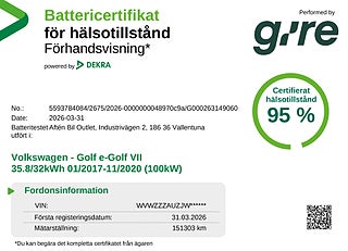 Volkswagen e-Golf är en tyst, smidig och helt eldriven vardags hjälte med härlig kör känsla och låga driftkostnader. Den erbjuder modern teknik, hög komfort och den klassiska Golf-kvaliteten i ett mer miljövänligt paket. En perfekt elbil för dig som vill ha stil, enkelhet och ren eldrift i vardagen.