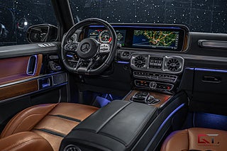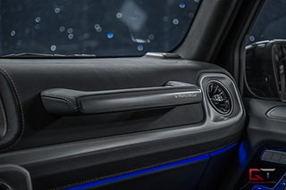 Det heta offroad-exemplaret klär sig minst sagt exklusivt i den påkostade lacken "MANUFAKTUR Oliv Metallic" och till de kombineras 22" stora kryssekerfälgar i svart, smått kromade detaljer och rödlackerade bromsok ihop för ett minst sagt sportigt intryck. På insidan fortsätter det heta temat med den sadelbruna G Manufaktur-interiören som klär dessa aktiva multikonturstolar exemplariskt i läder och framför föraren finner man den minst sagt sportiga AMG Performance-ratten som även kläs i läder. Dekorinläggen är exemplariskt utvalda för denna kupé och här strös öppenporig valnöt över och lämnar ett stilrent intryck, det kombineras bland annat med det högkvalitativa surroundljudsystemet från Burmester, samt med den öppningsbara glastakluckan som genomsyrar den tyska kupén.