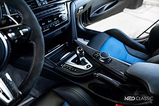 Exteriören är lackerad i exklusiva Macao Blue Metallic (en anspelning på originalet E30 M3 Sport Evolution), som är en färg reserverad för jubileumsmodellen och framtagen för att lyfta fram F80-generationens skarpa linjer och muskulösa proportioner. I kombination med M Shadow Line, M Star Spoke 666M-fälgar och subtila jubileumsdetaljer skapas ett uttryck som är både aggressivt och sofistikerat.