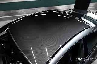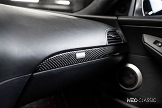 Bilen är lackerad i BMWs Space Grey Metallic exteriört, medans inuti finner du alla detaljer i kolfiber och sätena i Merino svart läder (Full leather package).