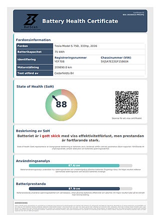 Tesla Model S med Dual Motor fyrhjulsdrift, 75 kWh batteri och obegränsad Supercharger-laddning (Fri SUC). En rymlig och bekväm elbil med bra prestanda, lång räckvidd och hög utrustningsnivå. State of Health (SOH) är 88 % se bild 6.