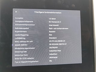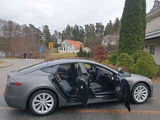 Free Supercharging. All Black. SÄLJ DIN NYARE PREMIUMBIL TILL OSS. Vi hämtar den hemma hos dig. Vänligen mejla stefan@shiftgear.se. Svensksåld Model S 75D med en underbar spec från tiden när mycket kostade extra. Tillverkad i sept och uttagen dec 2016. FORTFARANDE EN OCH SAMMA ÄGARE. EN (1) ÄGARE SEDAN NY. Pedantskött och därmed i mycket fint skick. Chrome Delete, dvs kromlister har maskerats i svart. Folierad hos Wrapzone med Hexis Argentic Matte Grey folie. Folierad sedan dag 1 så den svarta lacken under folien bör vara i mint condition. Strålkastare skyddas av transparent film. Fri laddning / Gratis obegränsad Supercharging bör följa bilen eftersom den beställdes innan den 15 jan 2017, så länge den inte säljs genom Tesla. Laddningen är uppdaterad till modern standard för CCS-laddning så att du kan ladda även på den senaste generationen av Superchargers med adapter. Uppgraderad dator till MCU2 *** På Blocket syns 38 bilder. På SHIFTGEAR.SE finner du länk till annons med ca 50 bilder *** Dual Motor fyrhjulsdrift AWD med två motorer. En fram och en bak. Sällan snabbladdad, oftast med 2 kWh upp till 80%. Välvårdad och servad med full dokumentation. 12V batteri bytt vid 6500 mil. Förebyggande fullservice hos Tesla på ägarens begäran vid 8200 mil. Parking brake calipers, byte bromsok, byte länkarmar, rear toe link och REAR UPPER LINK SUSPENSION ASSEMBLY vid 8700 mil (hos Grufman Bil). Backkamera bytt vid 10000 mil. Bromsvätskekontroll och Service av bromsar - Rengöring och smörjning av bromsar, liksom byte Kupefilter, HEPA-filter samt torkarblad, och byte bakre nedre kontrollarmar enligt Teslas servicebulletin vid 11400 mil. 19 tum Tesla original silver Slipstream fälgar för både sommarhjul och vinterhjul. Sommardäcken byttes i juni 2025: Michelin Pilot Sport 5. Vinterhjulen på bilderna, med GoodYear UltraGrip Ice 2 friktionsdäck köpta i dec 2021. Den här bilen finns i Stockholm. Hos Shiftgear har du sedan 2007 alltid kunnat reservera din önskade bil tryggt på distans. Förutsättningslöst och utan köptvång om du ej är nöjd vid hämtning. Vi är en ledande mäklare av bl.a. Tesla sedan märket kom. Vi erbjuder löpande ett brett utbud av samtliga modeller S 3 X Y Long Range, Performance och Plaid. Vi förbereder varje affär noga så att du vet exakt vad du har att förvänta dig. VILL DU HA MÖJLIGHET ATT FÅ MAXIMALT BETALT FÖR DIN NUVARANDE BIL MEDANS DU FORTSÄTTER NYTTJA DEN? Då kan du välja att anlita Shiftgear för att finna en köpare. Tidseffektivt och bekvämt på distans, oavsett var du bor. Vi förmedlar över hela landet till köpare som beställer från Sverige och från övriga Europa. Ett tryggt och smart samarbete för dig som inte måste sälja på dagen.