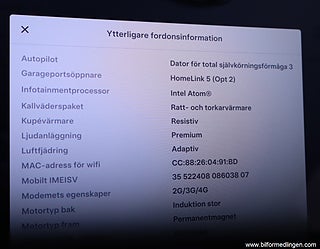 Moms (25%) följer fordonet. Pris angivet inkl.moms, Blis (Blind Spot Information System), Parkeringssensor fram och bak, Elmanövrerbart framsäte förare, Elmanövrerbart framsäte passagerare, Uppvärmda vindrutetorkare, Bluetooth anslutning för musik, Bluetooth anslutning för telefon, Vinterhjul friktion 21" Sommardäck på Tesla original alufälg, 19" Vinterdäck på alufälg, Adaptiv luftfjädring med åk komfort Mjuk Hård Komfort Sport, Acceleration Chill Sport Ludicrous Ludicrous+, Ljud vid korsande trafik bakom, Batterihälsotest utfört 251209 som visar 87, Moms finns på fordonet - Företagsleasing möjlig