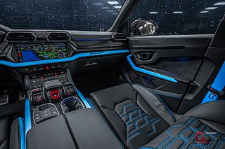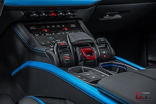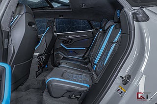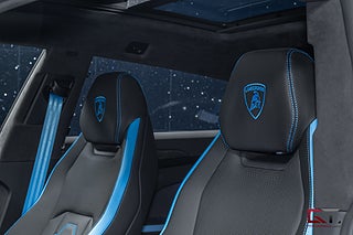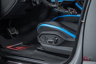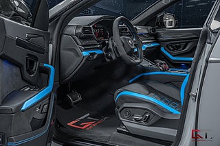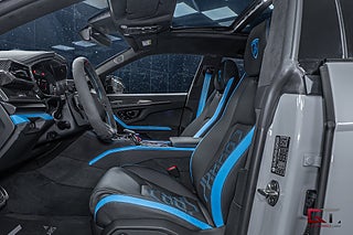 Just detta exemplar är välutrustat och exteriören klär sig i den extremt påkostade och exklusiva lacken "Grigio Hati" från segmentet Ad Personam Palette, de heta temat fortsätter runt om där det fulla style-paketet i svart högglans sammansätts av 23" stora och påkostade Taigete-fälgar i svart och baktill finner man även svarta bromsok som kramar om de högpresterande keramiska bromsarna. På insidan finner man i vanlig ordning en häpnadsväckande interiör med sportstolar klädda i Sportivo-interiören med svart läder och de sammansätts av detaljer i "Blu Cepheus" som även matchar den alcantaraklädda sportratten med kontrastsömmar i "Blu Cepheus". I den främre sätesraden kan man avnjuta av såväl värme som ventilation och härlig sätesmassage. Dekorinläggen klär kupén exklusivt med glansigt kolfiber, tack vare de påkostade och stora kolfiberpaketet som ger kupén en alldeles unik och sportig touch, det kombineras bland annat med det påkostade 3D advanced-surroundljudsystemet från Bang & Olufsen, samt med det stora och öppningsbara panoramaglastaket som genomsyrar kupén.