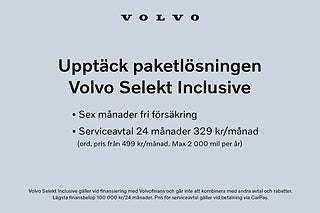 **Volvo Selekt** är begagnade bilar med förlängd garanti och finns endast att köpa hos din auktoriserade Volvohandlare. Våra certifierade bilar har genomgått omfattande kontroller enligt Volvo Begagnad Standard och levereras alltid med Volvo Assistans. Är bilen utrustad med Volvo on Call ingår dessutom ett abonnemang på 24 månader.