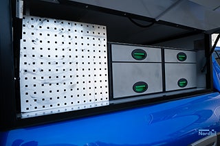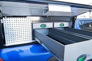 Det som verkligen särskiljer denna Hilux är den genomtänkta arbetslösningen i flaket. Bilen är utrustad med en praktisk kåpa med integrerade hyllor och lådor, vilket ger en organiserad och effektiv arbetsyta perfekt för verktyg och utrustning. Det utdragbara lastgolvet (lastsläde) gör lastning och åtkomst smidig och ergonomisk.