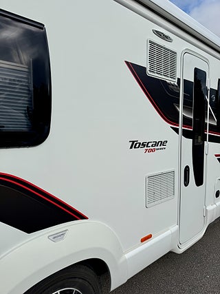 SWIFT 774 EB Edition. Toscane 700 Serien. Ny besiktiga. Gasolkontroll. Fukttestad 2025-09-09. Långbäddar. Ny framruta. ALDE. Solcell. Låga Långbädd. Längd 775cm. Bredd 235cm. Totalvikt 3850kg. Säljes för kunds räkning. Vi hjälper dig gärna med ett bra finansieringsförslag. Slå en signal eller skicka ett mejl så hittar vi en tid som passar er för visning.