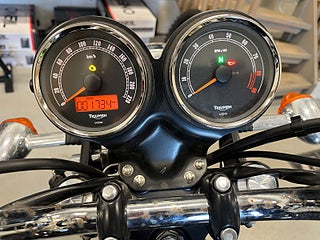 Finns i vår butik i Norrtälje. En chans att köpa en Triumph Bonneville T100 865 som knappt blivit använd. Den här hojen har bara gått 173 mil och är dessutom nyservad, vilket gör den till ett riktigt fynd för dig som vill ha en klassisk Bonneville med den eftertraktade luftkylda parallelltwinnen.
