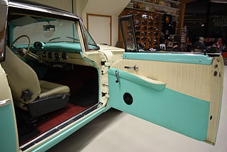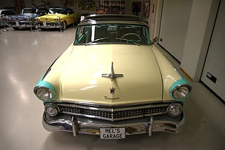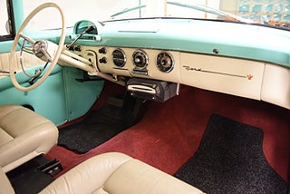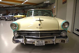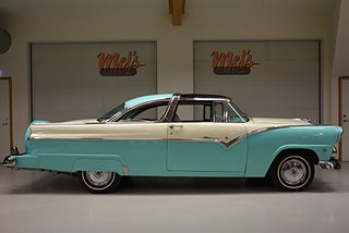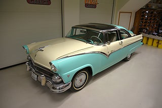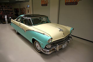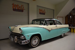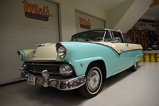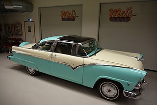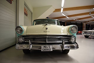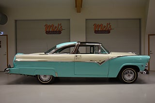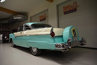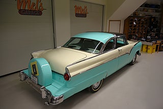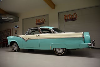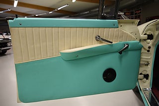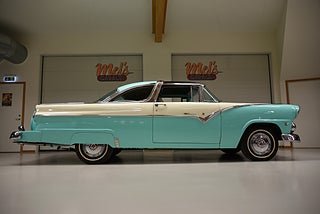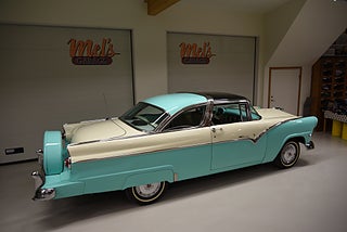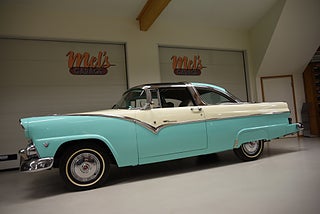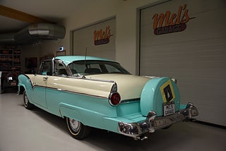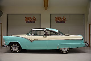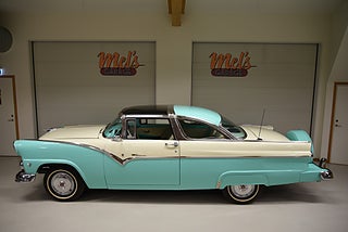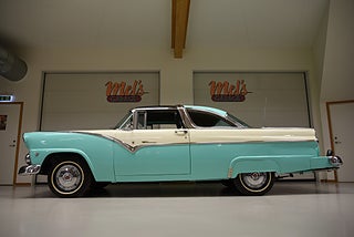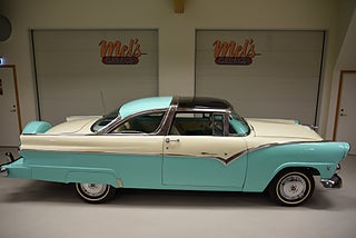 Mel’s Garage specialisten på förmedling av klassiska bilar med konstant stor efterfrågan på varierande modeller i olika prisklasser, All form av finansiering erbjuds, Wasa Kredit med 20% kontant eller My Money, Vi kan leverera eller hämta er bil över hela Sverige i öppen eller heltäckt transport till fördelaktigt pris. Totalt ca 100 bilder på denna bil finns på http://www.bytbil.com/handlare/mels-garage-6856, Denna gång har vi fått in en Ford Crown Victoria med glastak 1955. V8 302 som går super fint. C4 3 växlad automatlåda. Original bakaxel. Dubbelt avgassystem med korta headders. Trumbromsar fram och bak med servo och ny huvudcylinder. Bilen fick ny lackering för ett antal år sedan och är fortfarande i ett allmänt fint skick i kulören "mintgrön/vit". Inredningen i matchande kulör är i ett mycket fint skick där plasten sitter kvar i baksätet. Nyare stolar är monterade och tyvärr finns inte original soffan kvar. Kromet runt bilen är i ett bra bruksskick där det finns en del bulor i vissa lister. Bilen kommer från Colombia och kom i trafik 2012-09-19. Troligtvis var bilen tillverkad med en 272 y-block v8 motor original. Ny besiktigad 2025-11-29 och helt godkänd för trafik. Plåtfälgar med original kapsel och 195/75-15 däck med smal vit rand och ca 7mm mönsterdjup. En allmänt mycket trevlig Ford med en färg combo som sticker ut och fungerar utmärkt i drivlinan.