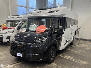 Hjuldrift: Framhjulsdrift, Märke chassi: Fiat Ducato, MAXIA T. Motor 180 hk/8-stegs automat vxl-låda, Truma Combi 6E och gastrycksregulator TRUMA DuoControl, Köksfläkt DOMETIC (ONTOUR C, PRESTIGE T. Ingår i Sverige paket för MAXIA T), 180 HK Automat med start/stopp-system och ECO-Pack på FIAT lågramschassi Maxi 4.4T, Bicolor lättmetallfälgar 16", Elstyrda och uppvärmda ytterbackspeglar, Förlängda ytterbackspeglar, Halogenstrålkastare med varselljus, Dimstrålkastare med kurvljus, Paket ?Lounge? (inkl. elektroniskt reglerbar klimatanläggning med pollenfilter och induktiv laddningsfunktion för smartphone samt digital instrumentangivelse som 7" TFT-färgdisplay), Lackerade stötfångare inkl. svart Skid-Plate, Ratt och växelspaksknopp i läderutförande och instrumentbräda med Techno Trim, ESP inkl. ASR och Hillholder samt intelligent traktionskontroll, bromssystem med fotgängardetektering, trötthetsvarnare och intelligenta hastighetsassistans, Post Collision Braking System, Farthållare inkl. adaptiv farthållare >30 km/h, Trailer Stability Assistent, Hyttlackering i svartmetallic, Förarhytt - Takfönster (öppningsbart) med dubbelglas och toning, Mörkläggningssystem DOMETIC för vindruta samt sidorutor i förarhytt, Alla ramfönster öppningsbara med dubbelt glas och toning samt mörkläggning och insektsnät, Markistält THULE OMNISTOR, Taklucka x 3 med mörkläggningsgardin och insektsplissé, Extra bred instegsdörr med fönster och förvaringsfack, Utdragslåda för gasolflaskor (passar till 2 x 11 kg-flaskor), GRP-golv med XPS-isolering, GRP-tak för optimalt hagelskydd, Akterförstärkning för cykelhållare, Insektsskydd för ingångsdörr, Stabila ytterlister av aluminium, Ventilerade sittgrupper och förvaringsskåp samt sängar, Garagedörrar på båda sidor med gastryckfjädrar, Överskåp med stort förvaringsutrymme, Garderob med innerbelysning, L-sittgrupp med pelarbord (kan svängas 360°), Tröskelfri övergång mellan förarhytt och bodel, Kylskåp (AES) DOMETIC (133 liters) med dubbelhängd dörr och absorptionsteknik, Gasspis av rostfritt stål med 3 lågor och elektrisk tändning samt glaskåpa, Kök med utdragslådor av komfortstorlek med fullt utdrag och softstängning, Ribbottensystem GOODSIDE®, Badrum bak med separat duschkabin, Vridbar toalett från THETFORD, Takdusch med duscharmatur och förvaringsytor, Färskvattentank frostskyddad 100 L, Gråvattentank isolerad och uppvärmd 96 L, Frostskyddade installationer i golvplattformen, Gasolregulator med övertryckssäkring (DIN EN 12 864) och slang, Bodelsbatteri Dual AGM 12V / 95Ah, Uttag i garaget 12 V / 230 V, Dubbel USB-laddningsport A/C 1x för bodel, Förberedelse för solpanel, Interiör stämningsbelysning, LCD-manöverpanel TRUMA Combi CP Plus, Förberedelse för takmonterad luftkonditionering, Varmvattensförsörjning i kök och badrum, Styrning för intern teknik via Hobby 7" touchmanöverpanel och Bluetooth med app inkl. HOBBY CONNECT, 9" pekskärm inkl. Apple CarPlay/Android Auto och backkamera, Extra högtalare för sittgrupp (två stycken), TV-uttag inkl. 12 V / 230 V och antennuttag