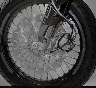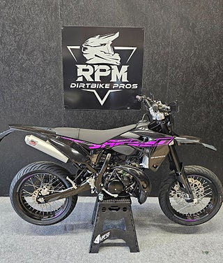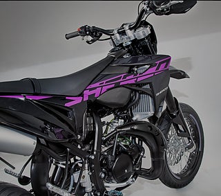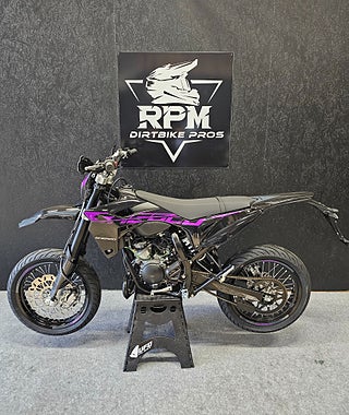 50cc SuperMotard modell med 17" fälgar skodda med greppvänliga Michelin däck. Kraftfull 300mm bromsskiva fram och rejäl fjädringsväg. Driftsäker Minarelli AM6 motor med Vattenkylning och separat oljetank.