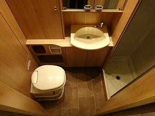 Gott om förvaringsutrymmen och längst bak i bilen en rymlig badrumsavdelning med separat dusch.
