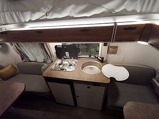 - StämningsbelysningXLmed indirekt ljus ovanförtakskåpen och ytterligare tvåERIBAmultifunktionsbatterilampor
