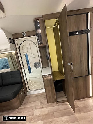 Extrautrustad med Komfortpaket 20139kr (Stort kylskåp. Nackkuddar. Handdukstork. Elektrisk uppfällbar säng och lastlucka). Designpaket 25319kr ( Fönster i dörr. Heki 2 taklucka. Formsydd golvmatta). Totalvikt upp till 2000kg 6797kr.