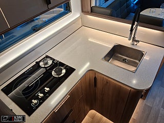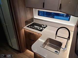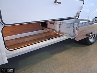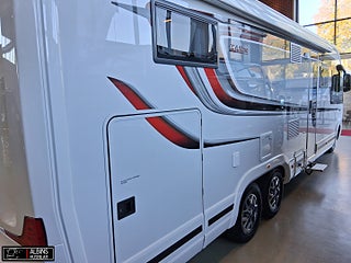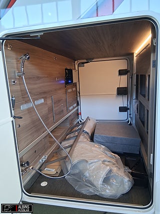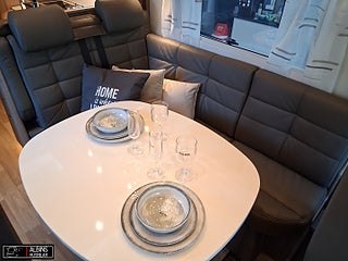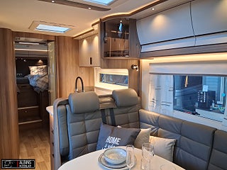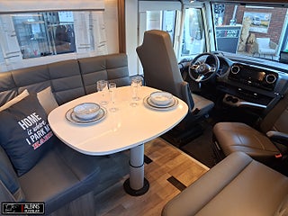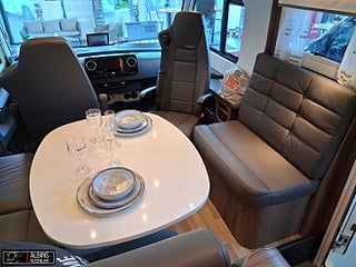 Hjuldrift: Framhjulsdrift, Klädsel: Hollywood - Grått skinn, Motortyp: Mercedes Benz Sprinter, EXTERN ANTENN TILL ROUTER, STOLSVÄRME/KYLA (FLÄKT) BÅDA STOLARNA MERCEDES, UTSKJUTBART FOTSTEG FÖRARDÖRR, Airbag förare- och passagerarplats, Aircondition bodel - Dometic Fresh Jet FJX4 2200, Innovation Design - Slät lackerad aluminiumplåt, Automatiskt golvvärmesystem AGS II Pro, Batterier - två stycken AGM 130 Ah, Belysning under arbetsbänksskivan i köket, Belysningsramper överskåp insteg och sovdel, Bränslevärmare motorkrets, Byggd pä Mercedes-Benz Sprinter, Centrallås på flera utvändiga luckor, Corian Savannah arbetsbänksskiva i köket, Distronic (adaptiv farthållare - avstånd till framförvarande fordon), DRL - daytime running light, Dubbelfönster i förardelen, Elektrisk huvudgärde på säng (ej standard i LGB-modeller), Elektrisk låsning av arbetsbänk, Elektrisk nedsänkbar taksäng ovanför dinetten, Elektrisk parkeringsbroms, Elektriskt öppningsbart passagerarfönster, ESP antisladd och antispinnsystem, Extra värmepaket i sidohurtsen kopplat till golvvärmesystemet, Flera förvaringsfack i instrumentbrädan, Färskvattentank 20/150 liter, Förar- och passagerarstol med integrerat säkerhetsbälte, Hartalux premium ? bred bodelsdörr, Heki II taklucka med myggnät och mörkläggningsgardin, Inbrottslarm med skalskydd - Defa, Klädsel bilstolar anpassade till val av klädsel, Konvektorer vid insteg till dörr, Kraschsensor på gasolsystemet (Monocontrol), LED-belysning halv- och helljus, MBUX inklusive backkamera, Mellantonade dubbelfönster - D-Lux grå metallic, Mörkläggningsgardiner (även bildel), Ny induktionshäll med 2 gasolbrännare, Nyhet! Active Lane Keeping Assist, Nyhet! Intelligent Speed Assist, Nytt Thetford-kylskåp och separat inbyggd ugn ovanför, Porslinsskåpsluckor abbia High Gloss, Premium Sound System med DAB, Regn- och skymningssensor, Rörelsesensor utebelysning, Spacers - bredare spårvidd, Spoltoalett med keramisk skål, Sänggavel - stoppad i mockaimitation med belysning, Termogardin nedtill i hytten, Upphängningslist med två krokar i köket, Utdragbart skidfack med värme och belysning, Vattenburen golvvärme i hytt med konvektorer i insteget, Vridplatta / utdragsskena gasol, Ytterbackspeglar elektriska (justerbara och uppvärmda)