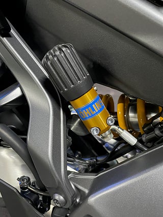 Upplev det spännande vridmomentet i EU5+ CP3-motorn på 890 kubik som aldrig förr, med förbättrade banfokuserade körlägen som kan anpassas till att passa olika banor eller förhållanden. Den SP-exklusiva DLC-belagda 41 mm KYB-framgaffeln i guld tillsammans med den fullt justerbara bakre Öhlins-stötdämparen för den mest förfinade Hyper Naked-körupplevelsen hittills.