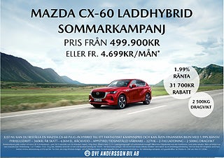 Upptäck nya vägar med 2025 Mazda CX-60 och dess pigga och följsamma köregenskaper. Den har förfinats med en rad kör- och hanteringsförbättringar, för mer dynamisk körning. Du kommer att älska den roliga körkänslan och utmärkta kurvtagningsprestandan som denna plattform erbjuder. Njut av det bästa av båda världarna. Mazda CX-60 laddhybrid ger dig en perfekt balans mellan kraft och effektivitet med en bensinmotor och en elmotor som arbetar tillsammans i harmoni – flera kraftkällor för maximal flexibilitet och noll räckviddsångest. Kör elektriskt i upp till 64 km. När batteriet är urladdat kan du ansluta till en laddstation eller fortsätta köra med bensinmotorn. Med en dragvikt på 2 500 kg kan du dessutom enkelt hantera tyngre laster. För mer information om Mazda CX-60, se https://www.mazda.se/modeller/mazda-cx-60/