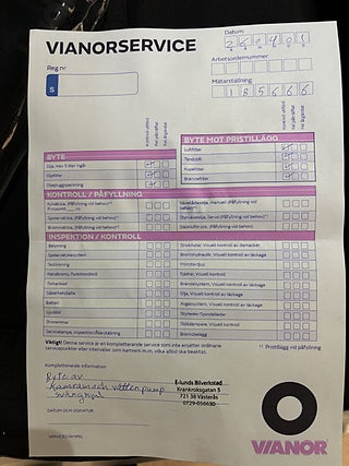 Senaste service, ny kamrem och svänghjul vid 18.566 mil. 2026-04-01.