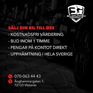 VARMT VÄLKOMMEN TILL OSS PÅ BILGRUPPEN. VI ORDNAR MED HEMLEVERANS I HELA SVERIGE! Vi hjälper självklart till med både finansiering & försäkring av din nya bil. Bilen går att köpa för 0 kronor i kontant insats för både privatpersoner & företag. Självklart tar vi din gamla bil i inbyte. OBS Vi reserverar oss för eventuella fel beskrivningar. VÅRA OBJEKT KAN FÅS MED 12-36 MÅN GARANTI FÖR DIN TRYGGHET! Eftersom vi har väldigt korta lagertider på våra bilar rekommenderar vi våra kunder att ringa för att kontrollera att fordonet finns kvar innan ni åker till oss. För bästa möjliga service kontakta oss gärna inför besök!