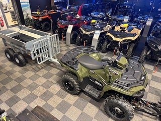 Polaris Sportsman 570 EPS T3B - 25 med vårt populära gårds paket med en multi trailer, Vinsch fram och ett snöblad. Multi trailer med tvådelade, avtagbara gavlar, avtagbara sidoväggar och få en mindre timmervagn. tippbar. 100% galvaniserad, Extra last bankar, Timmer galler i framkant , Lastutrymmets längd: 182 cm Lastutrymmets bredd: 66 cm nere/ 95 cm uppe Lastutrymmets höjd: 60 cm. Vikt: 200 kg med timmer hållare och sidor. Plogen är Polaris original 152 cm med smidigt snabb fäste.