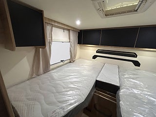 PACK TILLBEHÖR (Helintegrerad) : Utemarkis. 140W solpanel. dörrmyggnät. gardiner för förarhytt. utbyggnad för enkelsängar