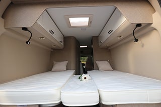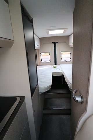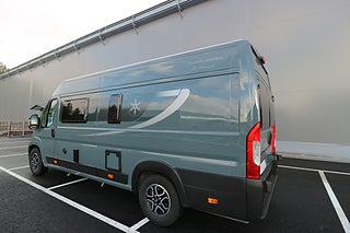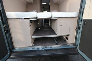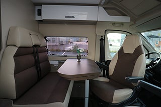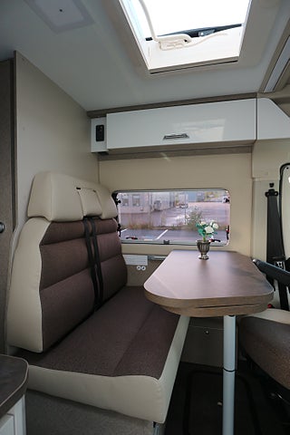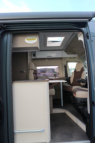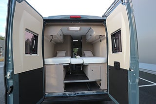 Körs även på vanligt B-kort oavsett när man tagit körkort då totalvikten ej överstiger 3500kg. Rejäla långbäddar bak för 2-3 personer samt 4 bältade platser.