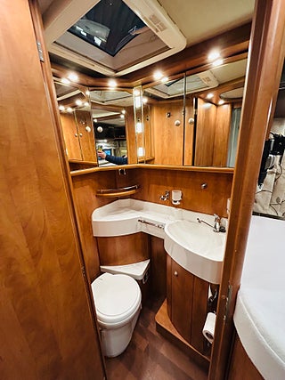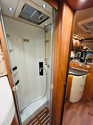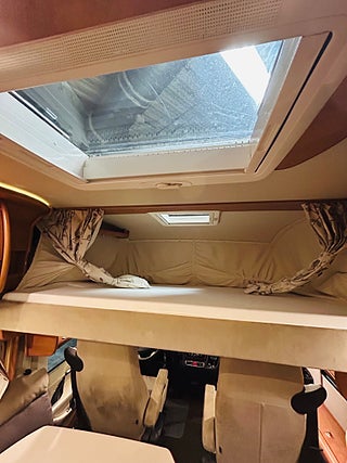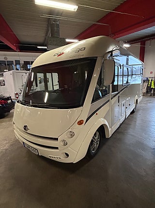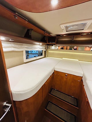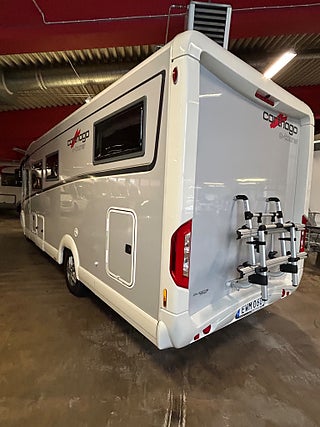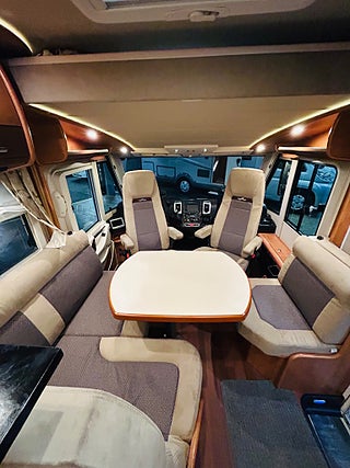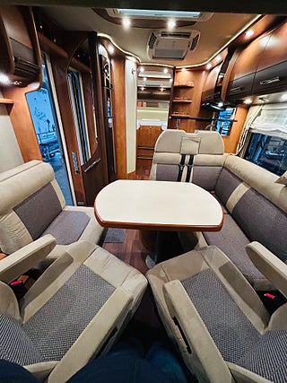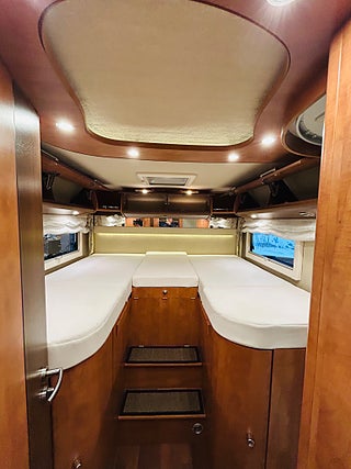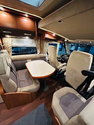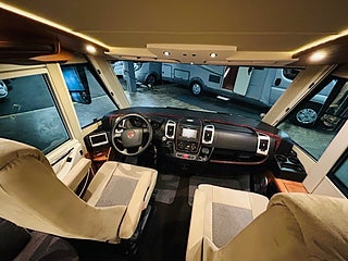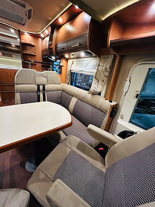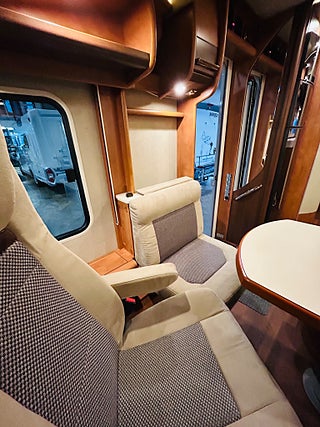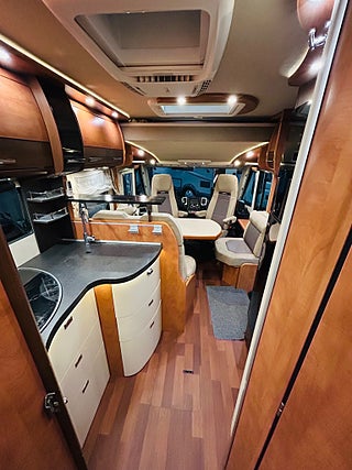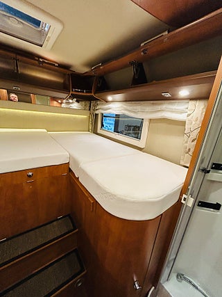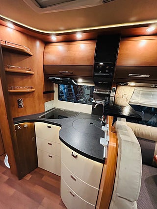 En husbil för den kräsne Carthago i 149 heliintegrerad med dropdown och två fina långbäddar med bäddtillsats i bakre sovrum i bakre sovrum, här märks det att vi talar om en bil där det inte har sparats något på. Ni kommer in i en sober miljö med fina snickerier som matchas med en två färgad Alcantara inredning av högsta klass. Vinkel kök med gasolspis, varm och kallvatten, stort kyl med separat frys och ugn, i det bakre sovrummet finns det gott om plats.