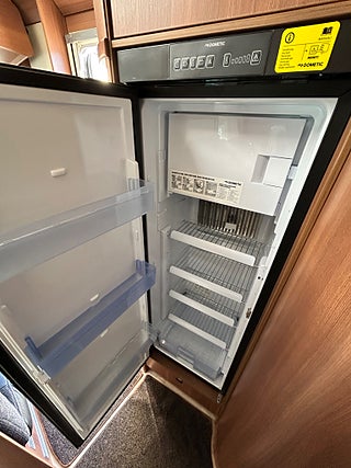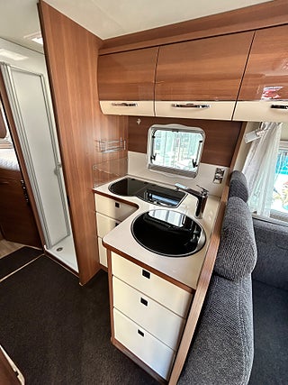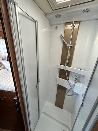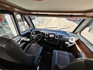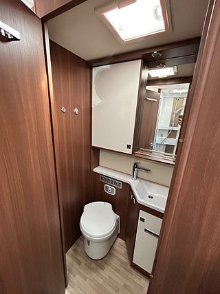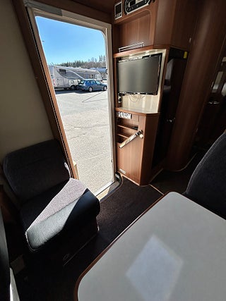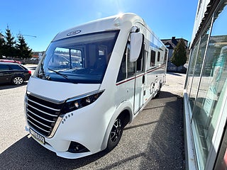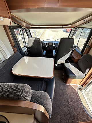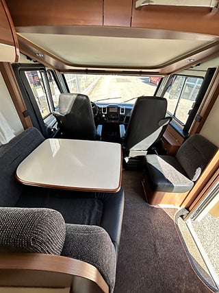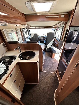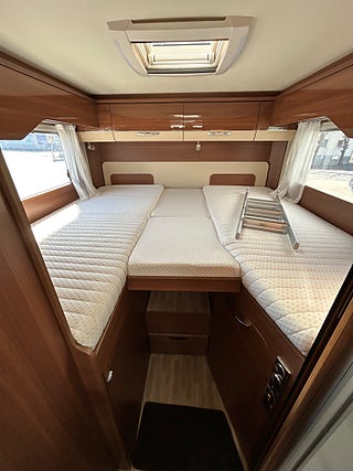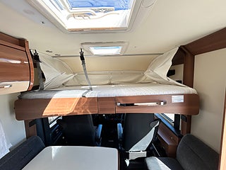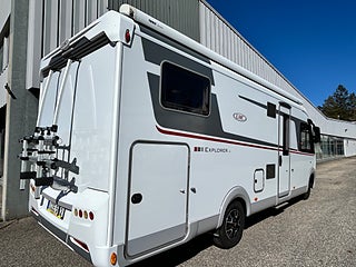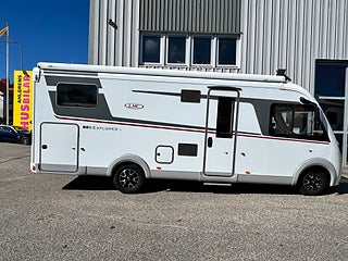 Nu har vi fått in en LMC 1735 EXPLORER en hleintegrerad bil med höga långbäddar som gjord för den Svenska marknaden med både automat, Alde vattenburen värme, dropdown och höga långbäddar i bak. Här kommer man in i en modern miljö med fina träslag på luckorna och lie mörkare textilier på soffor och stolar. Kök i mitten med gasolspis, stort kyl med frys och i det bakre sovrummet med sina höga enkelsängar finns det gott om plats.