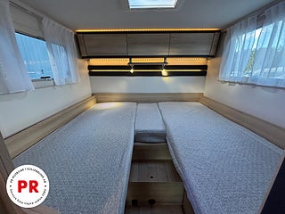 Modellår: 2026, Värmesystem: Truma - luftburen fläktvärme, Centrallås bil- och bodelsdörrar, Truma - luftburen fläktvärme, Klimatanläggning - bildel, Krocksensor för gasol under färd, Stort kylskåp med separat frys, Färskvattentank - frysskyddad, Extra bäddyna mellan långbäddar, Fönster med mörkläggning/myggnät, Multimediaspelare med Backkamera, Punkteringsset - Fix n Go, Lastluckor - dubbla till garage, Lastutrymme - stort garage, Täthetsgaranti - från tillverkare, Servicebok
