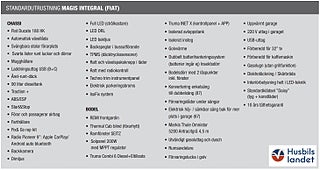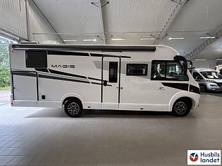 Upptäck en helintegrerad husbil som kombinerar elegant italiensk design med smart planlösning och generös standardutrustning. CI Magis 87 erbjuder rymlig bodel, bekväma sovplatser för upp till 4 personer, modern LED-belysning och praktiskt garage med gott om förvaring., Byggd på pålitliga Fiat Ducato-chassit med god körkomfort och säkerhetssystem som ABS och ESP, perfekt för både långa Europaresor och spontana weekendäventyr., En komplett och välutrustad husbil redo för nya upplevelser från dag ett., Svängbara stolar förarplats, Airbag förare och passagerare, Apple CarPlay/Android Auto, TPMS (Däcktryckssensorer), Läderklädd ratt och Växelspak, Elektrisk parkeringsbroms