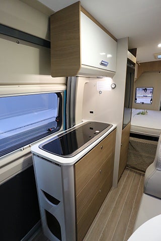 Rejäl köksbänk med flera förvaringsskåp samt 2lågig gasolspis med eltändning. Badrum med handfat & spoltoalett från Thetford med tillhörande toakassett som omvandlas till en duschkabin om så önskas. Fönstret på toan går att öppna och man får på så sett även en praktisk utedusch från utsidan av husbilen. Stor garderob.