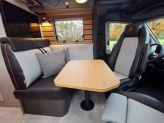 - Komfort-L-sittgrupp med lounge-dynor bord skjutbart i längd- och sidled samt 2 integrerade 3-punktsbälten