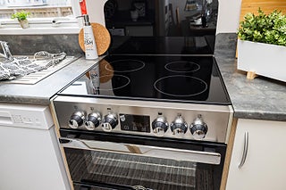 Köket är fullutrustat med spis och ugn. diskbänk samt snyggt inbyggd kyl och frys tillsammans med gott om bänkyta och förvaring.