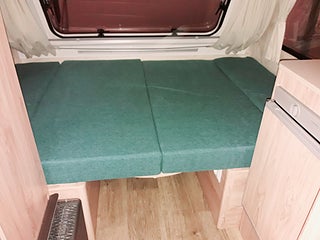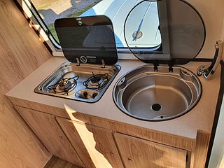 Fabriksny Hjovagn R välutrustad (se hemsida) med eller utan toalett, 2-lågig gasolspis, kylskåp, gasoldriven värme och ombyggbar sittgrupp till säng 124 x 186cm.